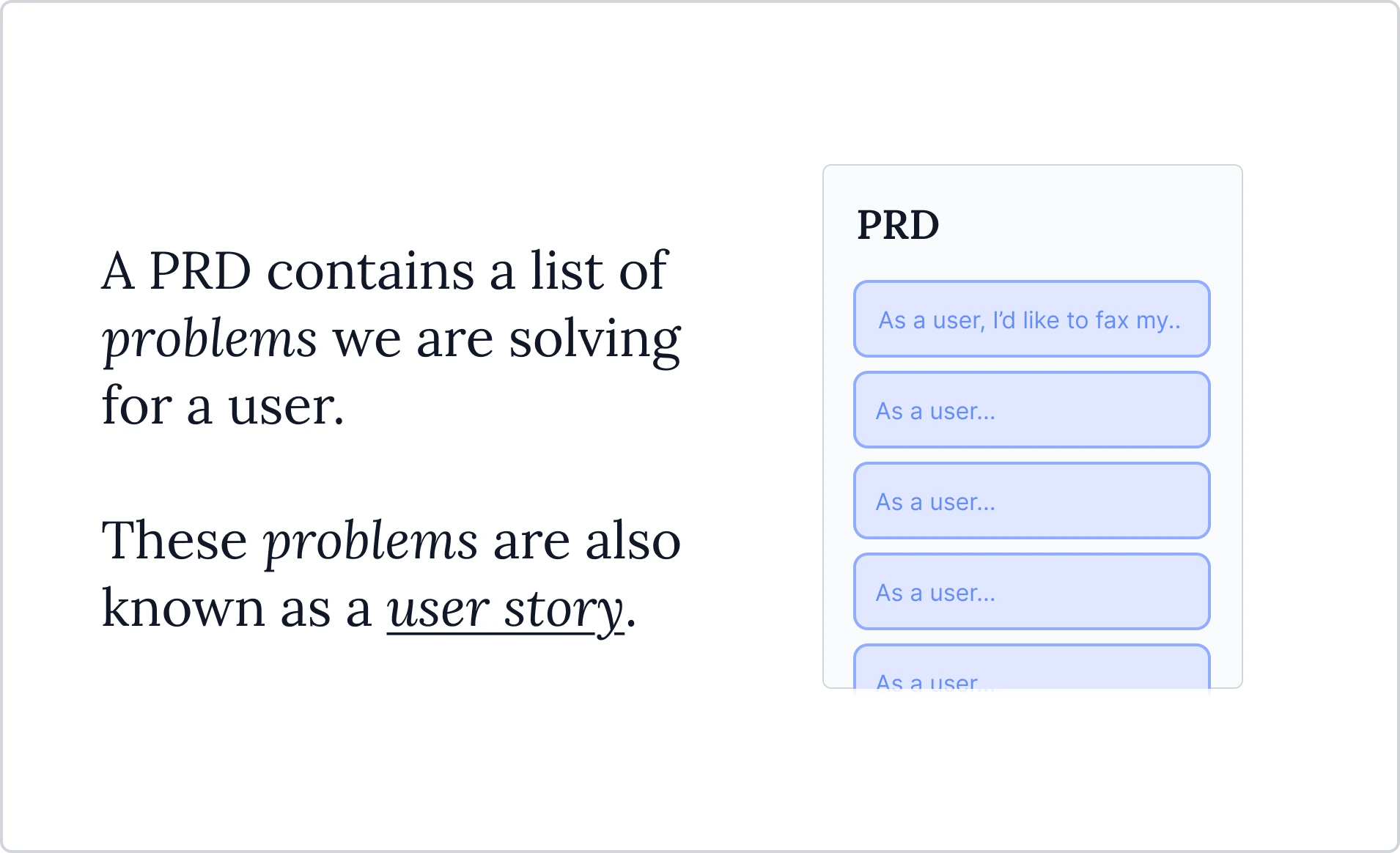 A Product Requirement Document (PRD) includes a list of user stories that the Product Manager (PM) wants solved.